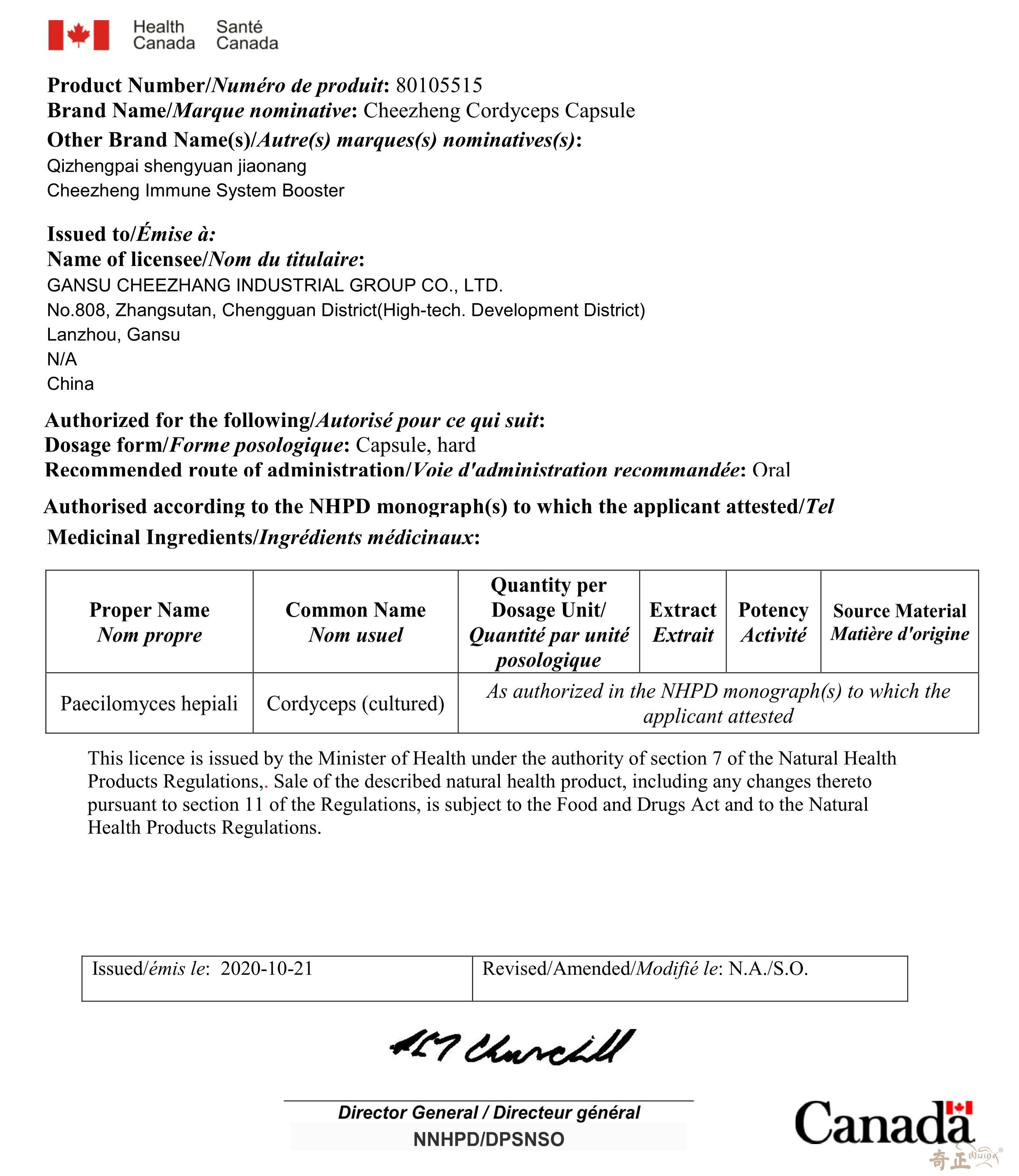 加拿大GMP證書(shū)-奇正牌圣元膠囊