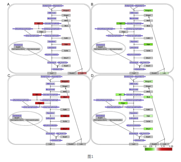 有趣的是,在海馬體和運(yùn)動(dòng)皮層中,與對(duì)照組健康大鼠相比,在安慰劑組CP大鼠中,各種膽固醇代謝途徑的催化酶的表達(dá)上調(diào),與安慰劑組CP大鼠(圖1)相比,白脈軟膏組各種膽固醇代謝途徑的催化酶的表達(dá)下調(diào)。同時(shí),膽固醇合成途徑中的Hmgcs1、Idi1和sql催化酶也發(fā)生了類似的改變。運(yùn)動(dòng)皮質(zhì)中只有Mvd、Fdps和Dhcr7發(fā)生改變,而海馬中沒有。與安慰劑組CP大鼠相比,白脈軟膏組CP大鼠Rps6ka1表達(dá)明顯降低。同樣,第40S核糖核糖核糖蛋白R(shí)PS8、RPS9、RPS25和RPS27的表達(dá)也受到了控制。