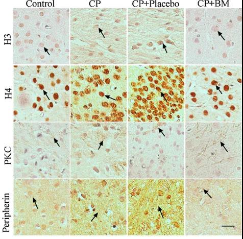 使用免疫組化法定位大鼠海馬中CP相關(guān)蛋白的表達(dá)(圖2),與對(duì)照組相比,在安慰劑CP大鼠中,組蛋白3.3和組蛋白4的表達(dá)被下調(diào)。然而,與對(duì)照組和安慰劑組相比,白脈組CP大鼠組蛋白3.3和組蛋白4表達(dá)上調(diào)。與對(duì)照組相比,模型組CP大鼠和安慰劑組CP大鼠的PKC-δ和外周蛋白表達(dá)上調(diào);然而,與對(duì)照組和安慰劑組相比白脈治療組CP大鼠的PKC-δ和周圍蛋白表達(dá)下調(diào)。