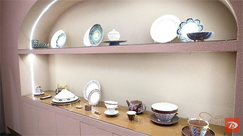 古絲綢之路,陶瓷是主角之一。陶瓷也是一種有著傳統(tǒng)審美延續(xù)的載體。九色鹿鳴瓷器《印象敦煌》系列中,茶咖杯型制采自唐代仕女狩獵紋八瓣銀杯以及鎏金蓮瓣紋銀高足杯;糖盒以唐代十二瓣形毌子扣合之南瓜形盒為范,就連頂上南瓜連梗,也是小心汲取了十二瓣凸起如意形蓮瓣圍繞瓜梗;一把湯羹勺,可看出唐代鎏金鏨花九曲銀勺的端倪;碗,是唐代鎏金海獸水波紋銀碗之樣。餐盤以及一些杯碟的紋飾,有著優(yōu)美的名字:石榴卷草紋、纏枝茶花卷草紋、蓮花紋等等,分別來(lái)自莫高窟壁畫中繁縟莊重的藻井、佛頭光、蓮花寶座和平棋。