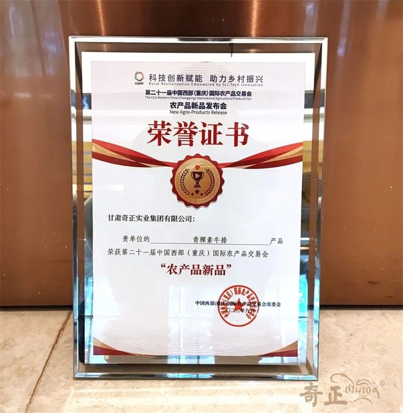 在此次大會(huì)上,青稞素牛排榮獲第二十一屆中國(guó)西部(重慶)國(guó)際農(nóng)產(chǎn)品交易會(huì)“農(nóng)產(chǎn)品新品”稱號(hào)。
