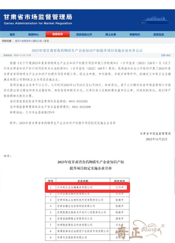 近日,甘肅省市場監(jiān)督管理局公布了2023年度甘肅省食藥物質生產企業(yè)知識產權提升項目的實施企業(yè)名單,蘭州奇正生態(tài)健康品有限公司(以下簡稱“奇正健康”)憑借自身知識產權實力和項目實施能力,被確定為甘肅省食藥物質生產企業(yè)知識產權提升項目的實施企業(yè)。全省僅有9家企業(yè)進入實施企業(yè)名單,目前已完成公示。